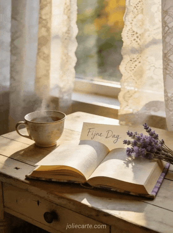 Stuur een inspirerende fijne daggroet met een open vintage boek op een houten bureau naast een kop thee en gedroogde lavendelstengels in zacht ochtendlicht. Bekijk ook een fijne dag gif of een goedemorgen en fijne dag.