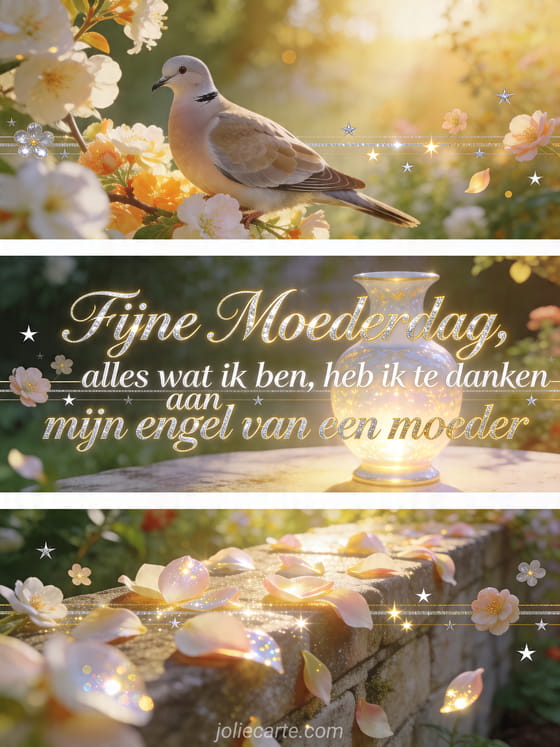 Deel een citaat voor Moederdag op een verfijnde realistische kaart met een tortelduif tussen heldere bloemen, een lichtgevende porseleinen vaas, sprankelende bloemblaadjes en een zonnige tuinmuur. Bekijk ook kaart voor Moederdag, kosteloze Moederdag afbeeldingen of fijne Moederdag berichten.