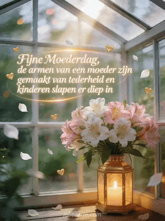 Deel een tedere Moederdagkaart met parelmoerschrift, witte bloemblaadjes, gouden hartjes, alstroemeria en een gloeiende kaarslantaarn in een heldere kas. Ontdek ook een citaat voor Moederdag, een kaart voor Moederdag of kosteloze Moederdag afbeeldingen.