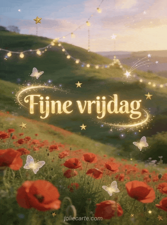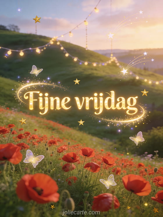 Verstuur een cyber fijne vrijdag kaart met lichtgevende gouden letters, vallende sterren en een heuvel vol rode klaprozen boven een groene vallei. Deel een heldere wens voor het einde van de week en ontdek ook mooie afbeeldingen om een fijne vrijdag te wensen, fijne vrijdag humor gif of goedemorgen fijne dag op vrijdag kusjes.