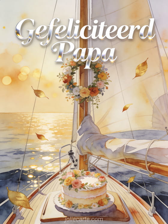 Stuur een verfijnde cybercarte gefeliciteerd papa met een zeilboot op een rustige herfstzee, verjaardagstaart en bloemenkrans. Bekijk ook een vader gefeliciteerd papa verjaardagskaart of een gif fijne verjaardag papa.