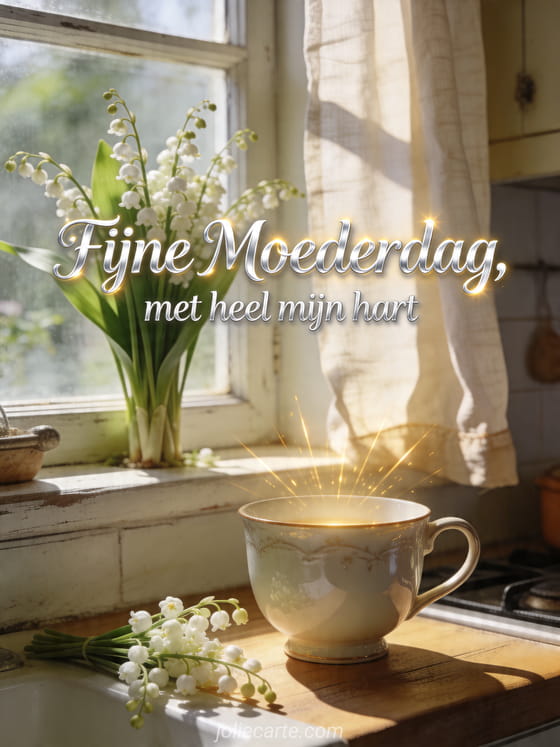 Deel een rustige groet met een rustiek keukenraam vol lelietje-van-dalen, een porseleinen kopje en zonverlichte linnen gordijnen. Stuur ook hoe je je mama fijne Moederdag wenst, Moederdag foto of Moederdag gedicht.