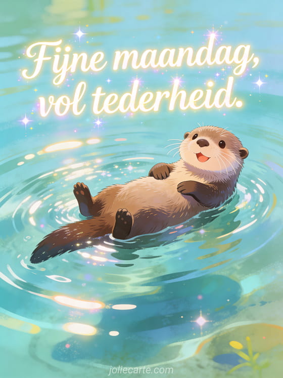 Stuur een tedere fijne maandag-groet met een speelse otter die drijft in helder water met glanzende rimpels. Bekijk ook maandag kusjes gif, goedemorgen maandag kaart of goedemorgen fijne maandag koffie.