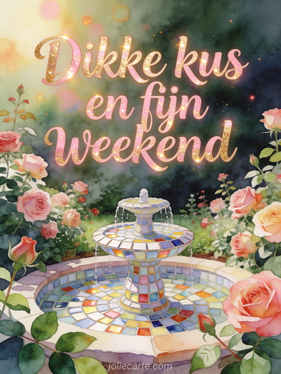 Deel royale weekendwarmte met oude rozen die rond een kleine tuinfontein en heldere mozaïekstenen overlopen in zonnige aquarelglans. Je kunt ook fijn weekend en dikke kussen, kusjes fijn weekend of dikke kussen fijn weekend sturen.