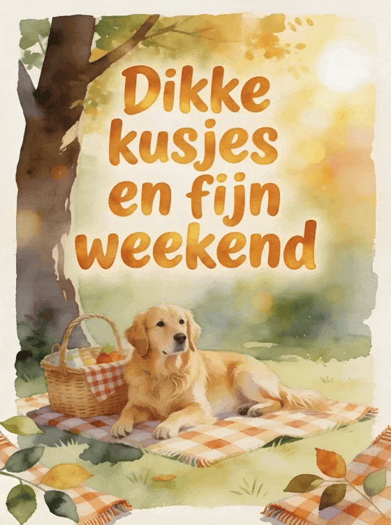 Wens een vrolijk weekend met speelse letters, een Golden Retriever hond onder een zonnige boom, een picknickmand en een geruite deken. Ontdek ook fijn weekend dikke kus gif, fijn weekend vlinder kusjes of gif fijn weekend kusjes.