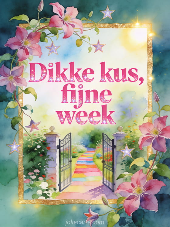 Deel warme wensen voor de week met rozerode letters, clematisranken en een tuinpoort die opent naar een kleurrijk pad in gouden licht. Ontdek ook een fijne week allemaal kusjes, een fijne week voor jou kussen kaart of een fijne week iedereen groet.