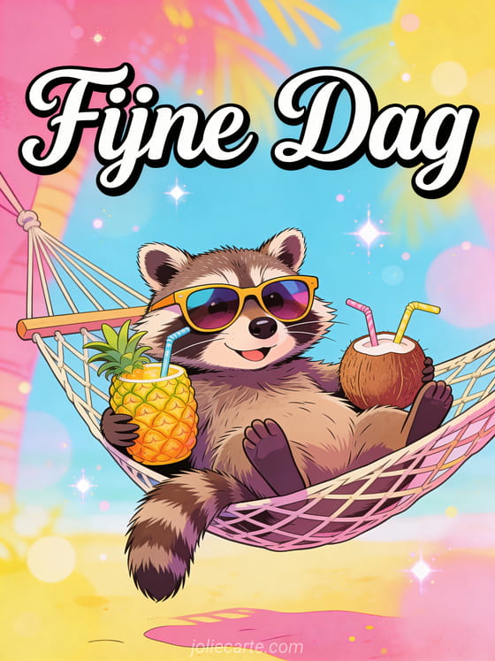 Stuur een hilarische donderdag humor wens met een dwaze wasbeer in een oversized zonnebril die ontspant in een hangmat met tropische drankjes. Ontdek ook een goedemorgen en fijne donderdag kaart of een goedemorgen donderdag kaart.