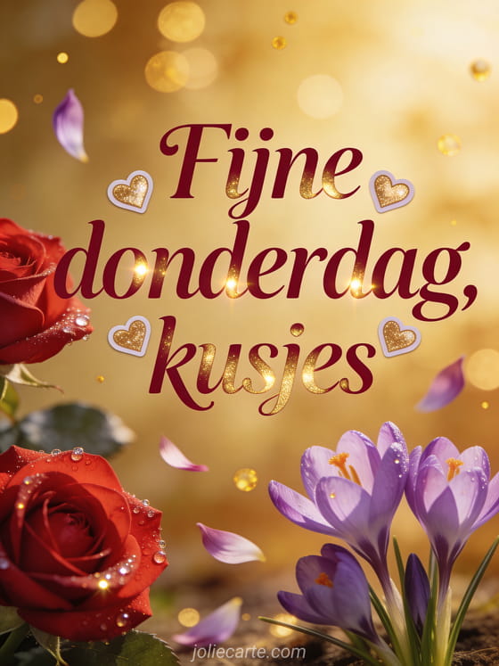 Stuur een romantische kaart voor fijne donderdag, kusjes met elegante bordeauxrode letters, gouden hartjes, tere paarse krokussen, rode rozen met glinsterende dauw en warm golden-hour licht. Ontdek ook fijne donderdag voor kerst, fijne donderdag in de regen gif of gratis fijne donderdag afbeeldingen.