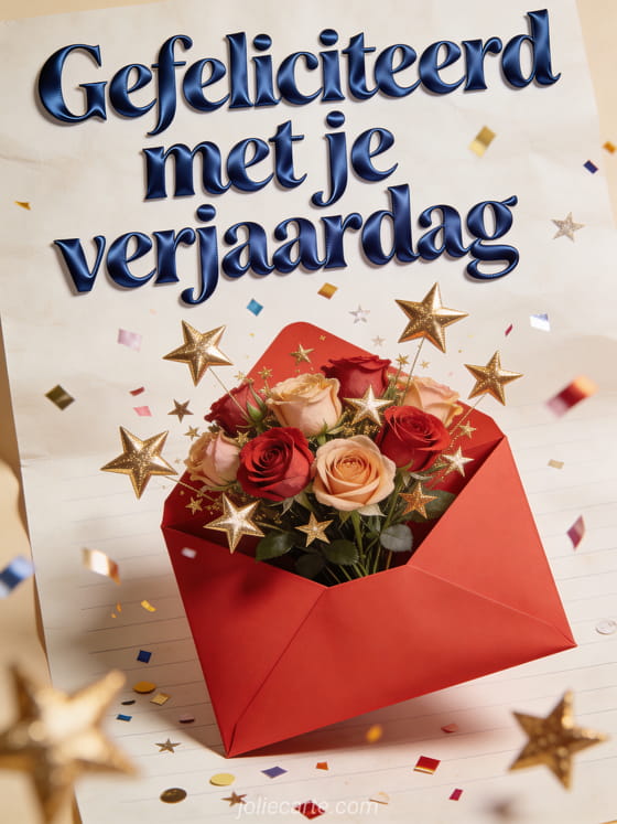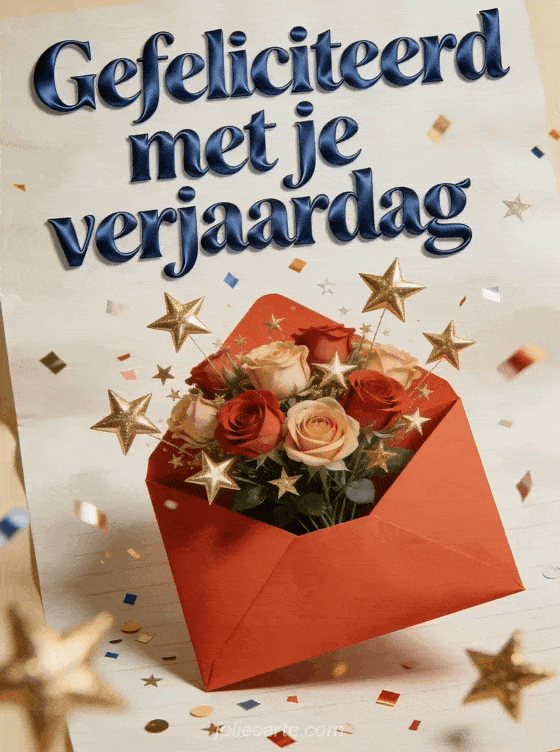 Stuur een kleurrijke vrolijke verjaardagsgroet met een rode envelop waaruit een boeket rozen en gouden sterren verschijnen. Confetti vliegen weg voor een feestelijke verrassing! Bekijk ook gefeliciteerd verjaardag paard gif geanimeerd of verjaardagskaart kat geanimeerd gratis.