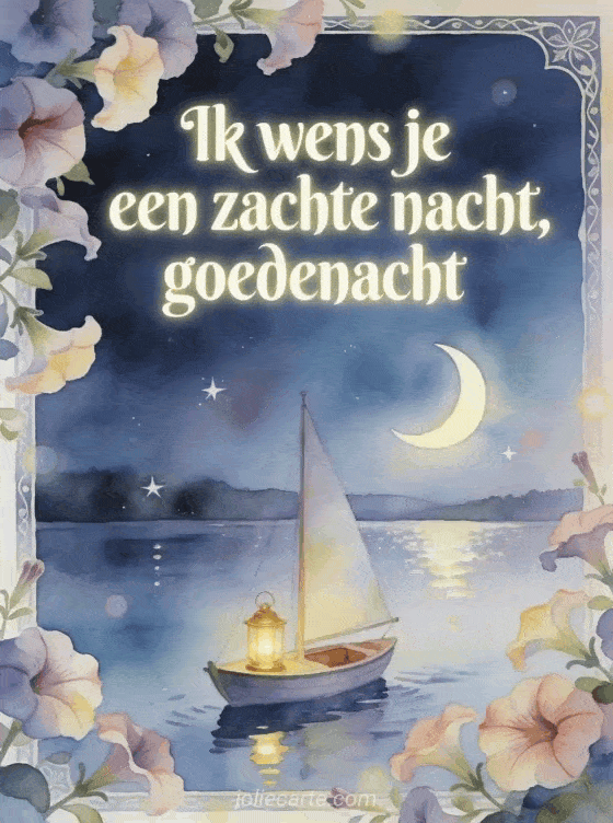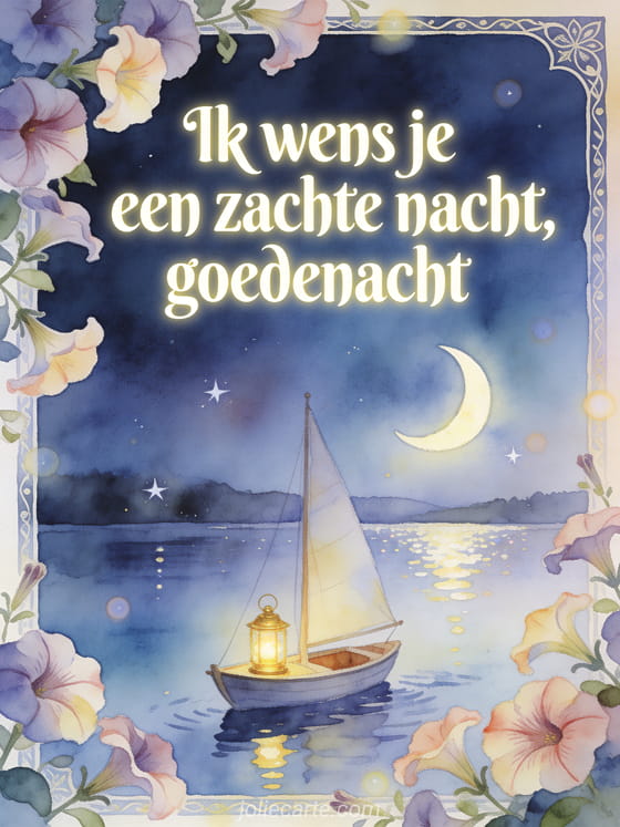Stuur een rustig goedenachtbericht met ivoorkleurige tekst, petunia's, een kleine zeilboot met een gouden lantaarn op een stil meer onder een maansikkel. Bekijk ook een goedenachtbericht voor een vriendin, een een klein goedenachtbericht of een romantisch welterusten bericht.