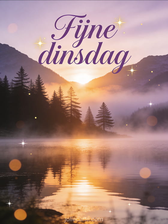 Stuur een rustige fijne dinsdag groet met een gouden zonsopkomst boven een nevelig bergmeer en elegante paarse letters. Ontdek ook een fijne dinsdag en fijne dag gif, een fijne dinsdag kusjes afbeeldingen of een fijne dinsdag fijne dag gif.