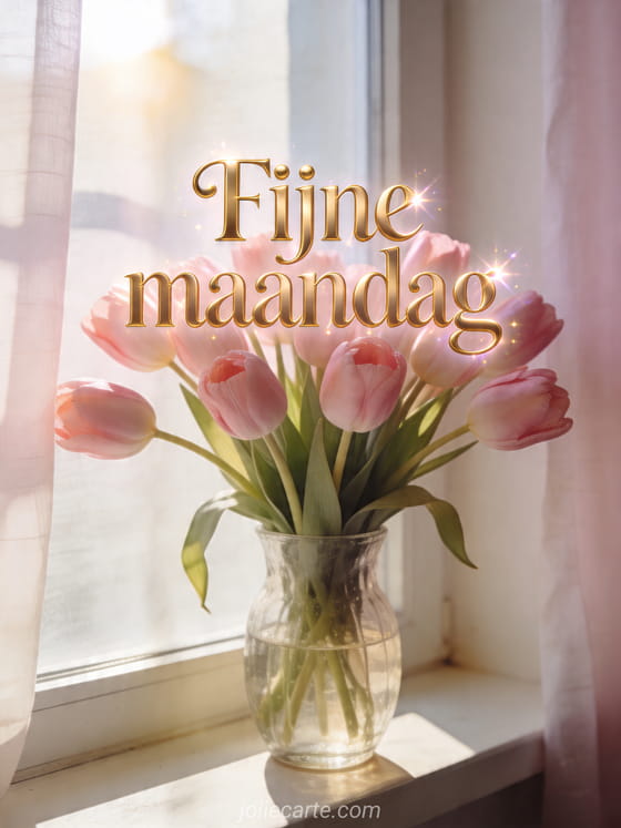 Begin de week zacht met deze elegante kaart waarop een boeket roze tulpen in een glazen vaas op de vensterbank staat in het ochtendlicht. Ontdek ook goedemorgen fijne maandag fijne week kusjes, goedemorgen maandag goed begin van de week of grappig fijne maandag.