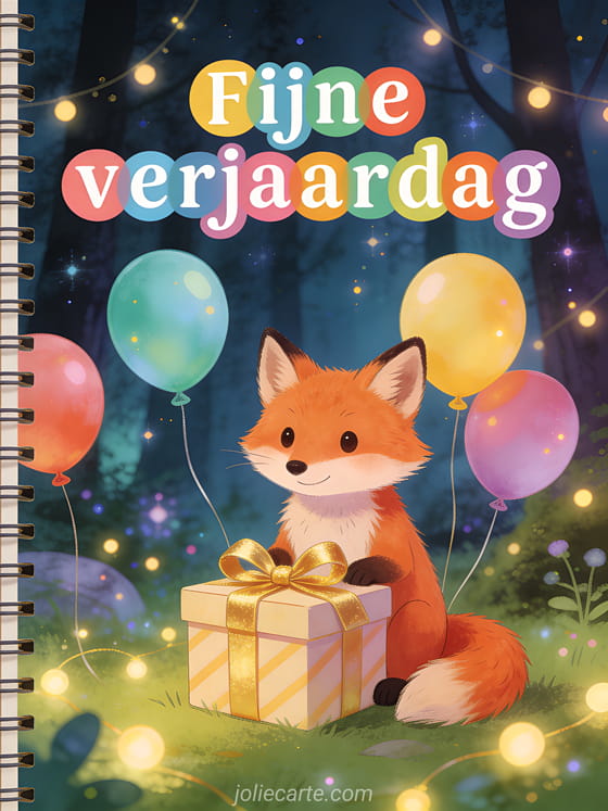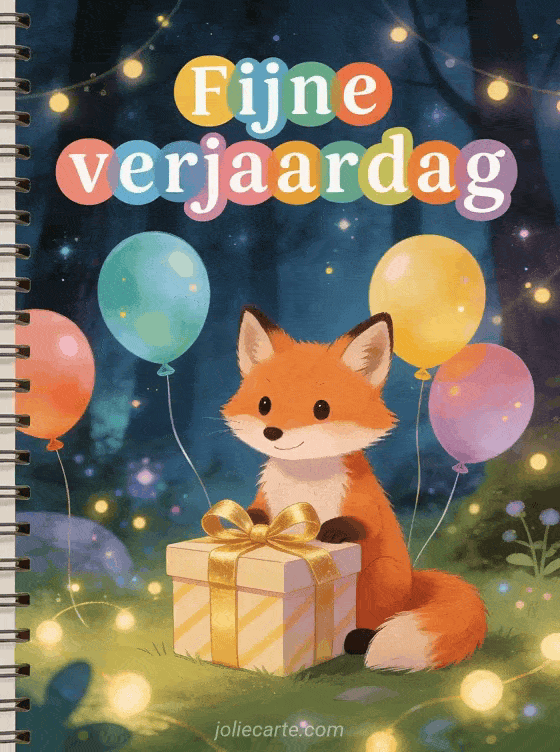 Vier een fijne verjaardag met deze betoverende kaart met een lieve vos, een cadeau met gouden strik en kleurrijke ballonnen. Ontdek ook gefeliciteerd gif rood, heel fijne verjaardag en gif fijne verjaardag muzikaal.