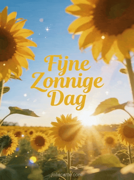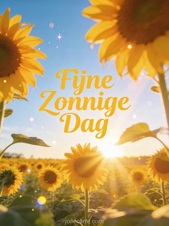 Stuur een warme fijne zonnige dag groet met deze gratis wenskaart. Een schitterend zonnebloemenveld bij zonsopgang, gouden licht dat het hele tafereel overgiet, een heldere blauwe lucht en een warme zomerse sfeer met zachte dromerige bokeh en sprankelende lichtdeeltjes. Bekijk ook een fijne dag kaart of een goedemorgen en fijne dag.