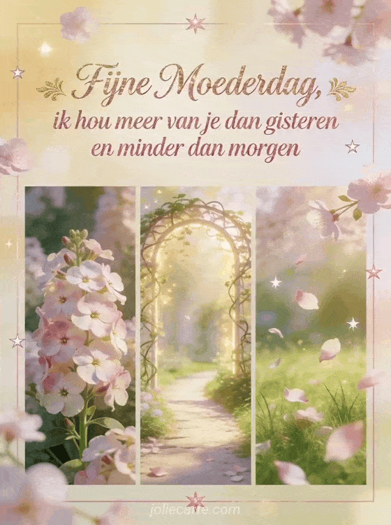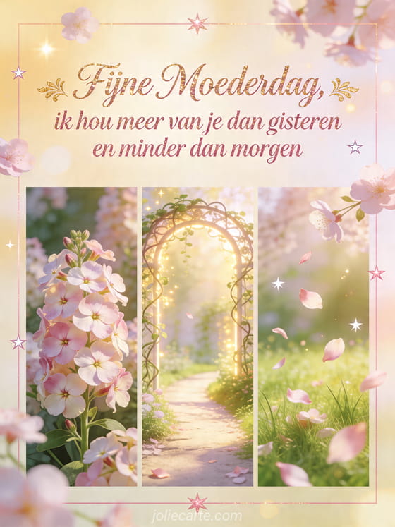 Deel een gedicht voor Moederdag in een dromerige illustratie met drie panelen, weelderige vlambloem, een lichtgevende tuinboog, zwevende bloemblaadjes boven een helder pad, bloesems en sterren. Bekijk ook afbeeldingen voor Moederdag, foto voor Moederdag of Moederdag rijmgedichten.