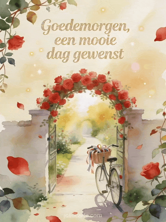 Stuur een goedemorgen bericht met een zonnige kaart die opent naar een rozentuin, perfect om iemand een mooie dag te wensen. Deel ook ochtend hallo, een goedemorgen bericht voor zijn vrouw of ochtend hallo sms.