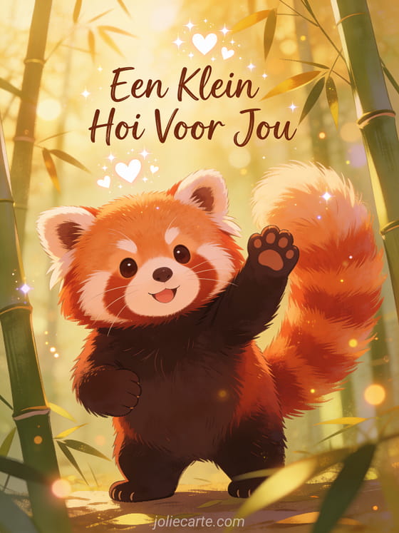 Stuur een persoonlijke een klein hoi voor jou kaart met een schattige donzige rode panda die zijn pluizige staart zwaait in een bamboebos met zacht ochtendlicht. Ontdek ook een hoi geel kaart of een hoi grappig kaart of een een klein hoi kusjes kaart.