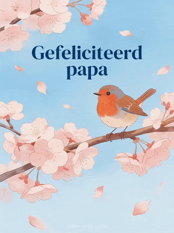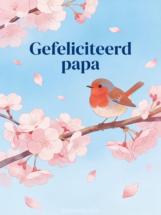 Stuur papa een eenvoudige maar mooie verjaardagskaart met een roodborstje op een bloeiende kersentak met neerdalende roze bloemblaadjes. Bekijk ook tekening verjaardag papa.