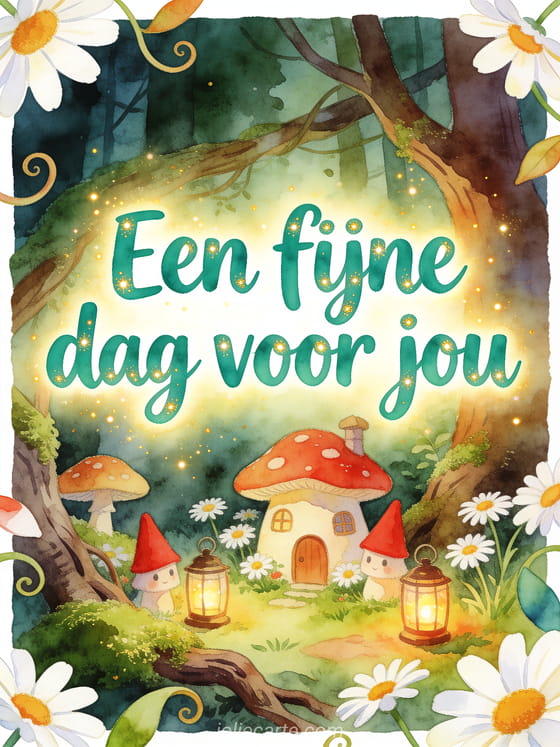 Deel een heldere fijne dag boodschap met paddenstoelhuisjes, kleine rode punthoeden, lantaarns, margrieten en wortels met mousse. Stuur ook fijne dag kat gifs, goedemorgen en fijne dag afbeeldingen of fijne zonnige dag tekst.