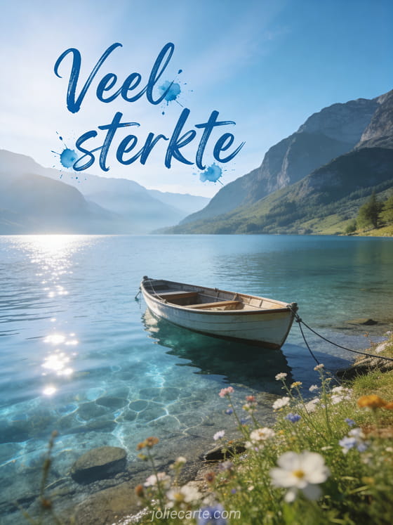 Stuur een prachtige kaart met een kristalhelder bergmeer en een aangemeerde roeiboot in het ochtendlicht om iemand serene kracht en sterkte te wensen. Bekijk ook een veel sterkte bloemen, veel sterkte in deze moeilijke momenten of veel sterkte positieve vibes humor.