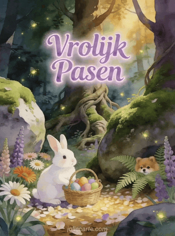 Stuur een gratis geanimeerde gif voor de paasdagen en tover een sprookjesachtige bossfeer op voor je dierbaren. Bekijk ook een vrolijk paasfeest afbeelding, een feestdagen geanimeerde gif vrolijk pasen of een afbeelding paasklokken.