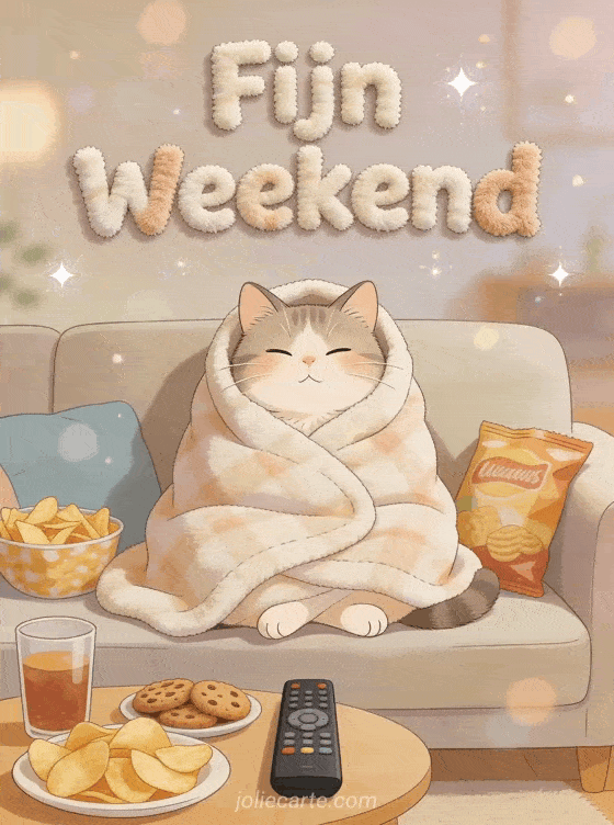 Stuur een hilarische weekendgroet met een tevreden kat gewikkeld in een deken die tv kijkt in ultieme luie modus. Bekijk ook een fijn regenachtig weekend humor of een kaart fijn weekend.