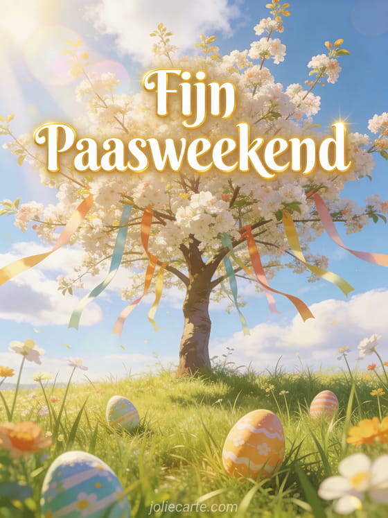 Stuur een vrolijke kaart voor een fijn paasweekend met een groen lenteweide en een boom vol bloesem. Ontdek ook een fijne tweede paasdag wensen of een vrolijke paaszondag.