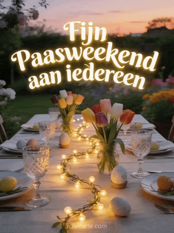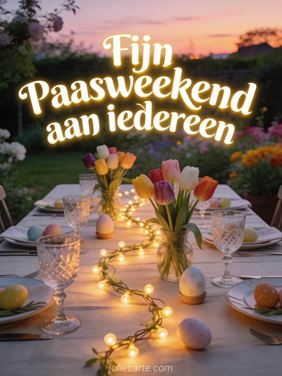 Stuur een gezellige paaskaart voor een fijn paasweekend aan iedereen met een buiten feestgedekte tuintafel. Ontdek ook een foto's fijn paasweekend of een fijne paaszaterdag.