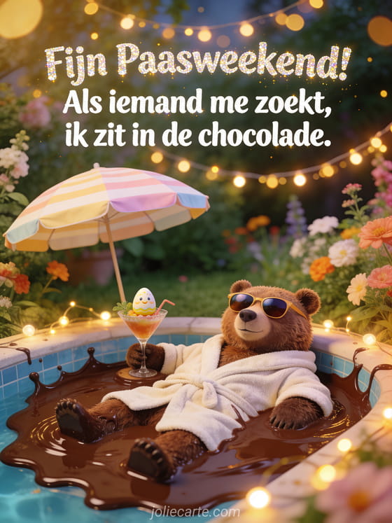 Stuur een humoristische kaart voor een fijn paasweekend met een beer die baadt in vloeibare chocolade. Ontdek ook een grappige afbeelding pasen of een kaart pasen humor.