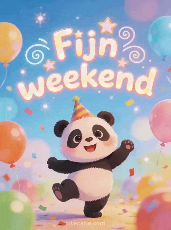 Deel een grappig fijn weekend met deze gratis kaart en begin het weekend met ballonnen, confetti en glimlachen. Ontdek ook zonnig fijn weekend gif, fijn weekend natuur of fijn weekend kusjes.
