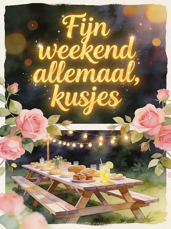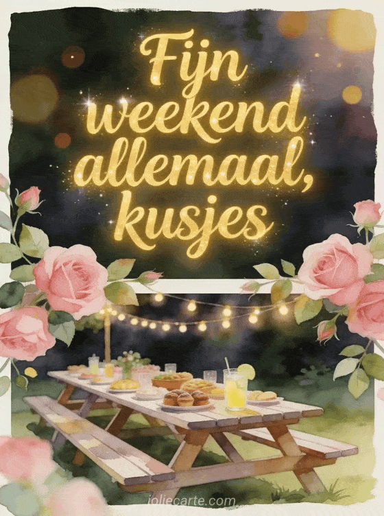 Deel een vriendelijke weekendboodschap met roze rozen, een lange picknicktafel, gebak, limonade en een lichtslinger. Stuur ook dikke kusjes en fijn weekend, een fijn weekend dikke kusjes gif of fijne vrijdag fijn weekend kusjes.