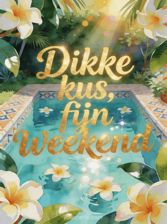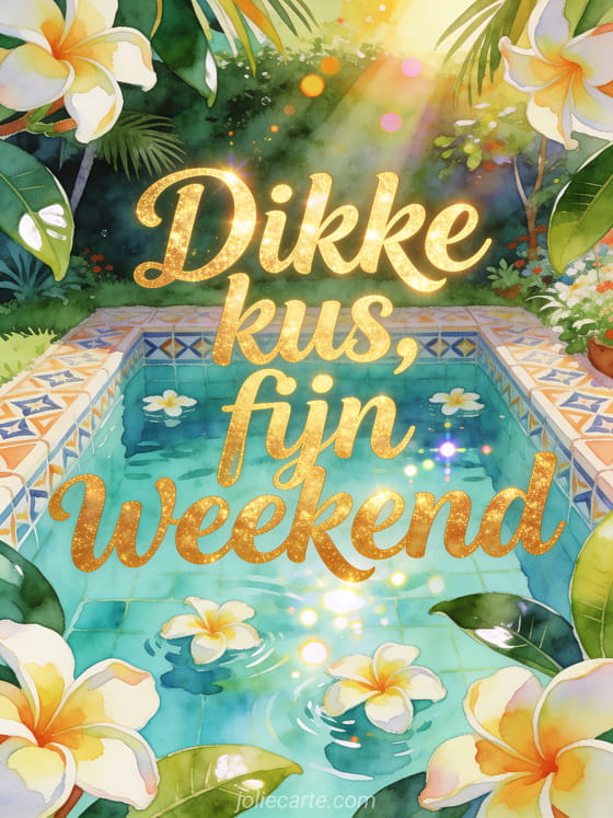 Stuur een vrolijke weekendkaart met levendige aquarelletters, frangipanibloemen, een turquoise zwembad in de tuin, tegels met patroon en tropisch zonlicht. Ontdek ook een fijn weekend vlinder kusjes, een gif fijn weekend kusjes of een fijn weekend kusjes mooie afbeeldingen.