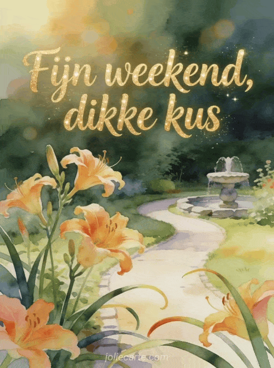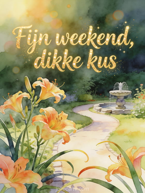 Deel een liefdevol weekendmoment met aquareldaglelies, een slingerend tuinpad en een kleine stenen fontein in warm zonlicht. Je kunt ook fijn weekend met kusjes, kusjes weekend of een fijn weekend kusjes afbeelding sturen.