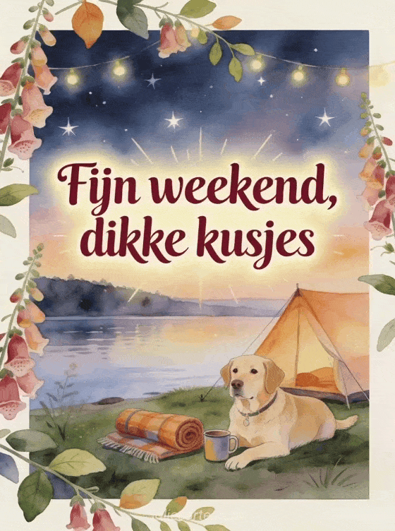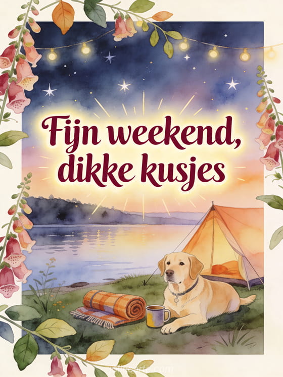 Deel weekendliefde met een labrador hond bij een tent aan het meer, een campingmok, een opgerolde deken en vingerhoedskruid. Stuur ook weekendkusjes, weekend kusjes of een fijn weekend dikke kussen afbeelding.
