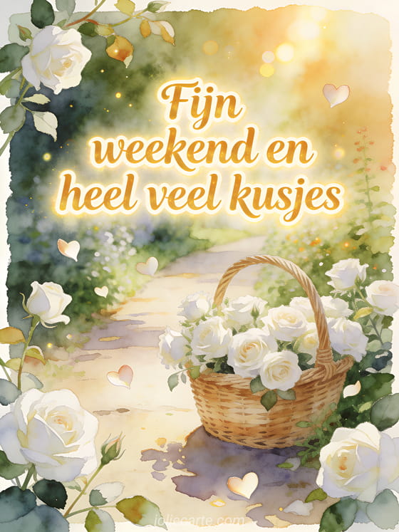 Stuur een tedere kaart met witte rozen rond een rieten mand op een zonnig tuinpad en hartvormige bloemblaadjes. Ontdek ook een kusjes en fijn weekend, een kusjes fijn weekend afbeelding of kusjes laatste weekend van het jaar.