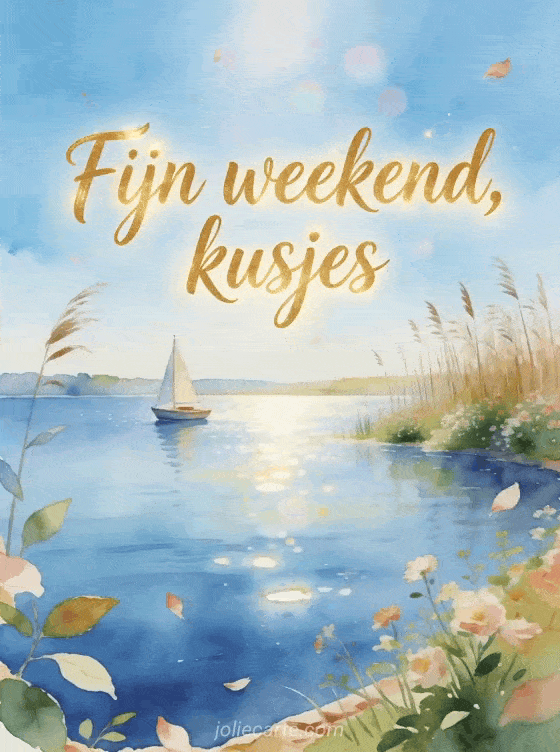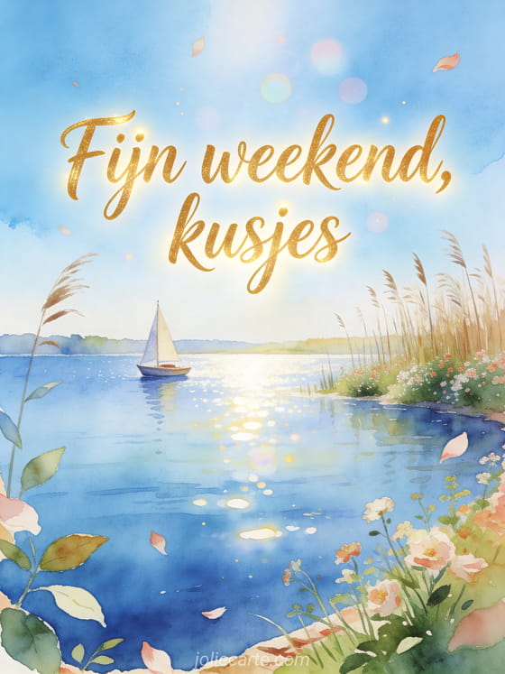 Stuur een rustgevende weekendkaart met luchtige aquarelletters, een kleine zeilboot op een helderblauw meer, riet en oevers met wilde bloemen voor een vredige ontsnapping. Ontdek ook een dikke kus fijn weekend kusjes, een fijn weekend dikke kus gif of een fijn weekend vlinder kusjes.