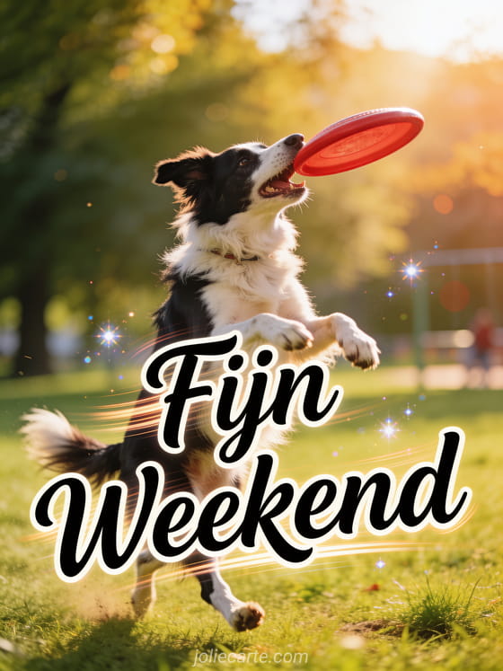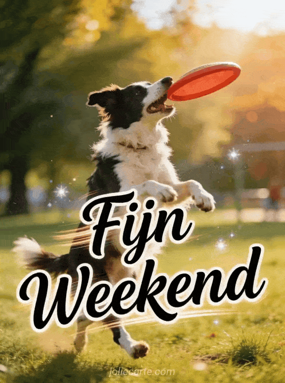 Stuur een fijn weekend gif vol energie en enthousiasme. Een opgewonden border collie die een frisbee vangt is de perfecte sportieve weekendwens. Ontdek ook afbeeldingen van fijn weekend of een geanimeerde gif weekend humor.