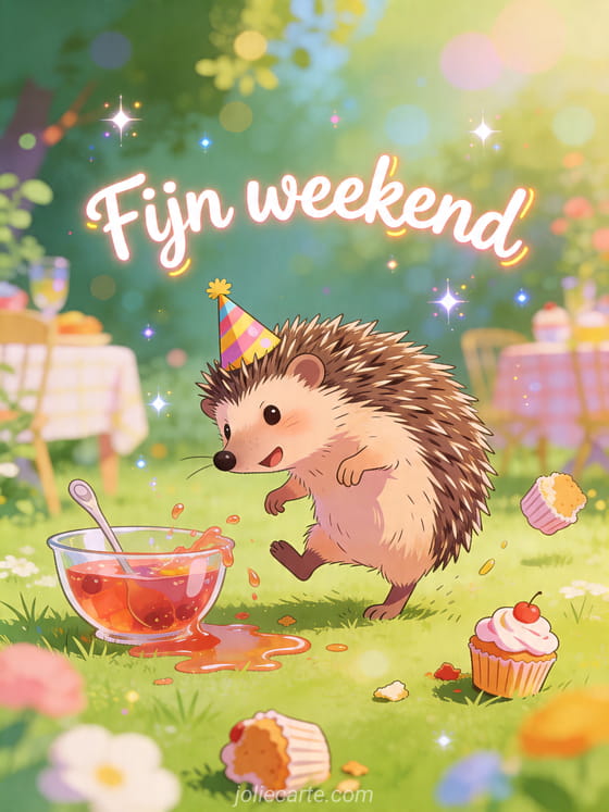Deel deze grappige fijn weekend kaart met een wankele egel, cupcakes en een heerlijk rommelig tuinfeest. Ontdek ook fijn weekend, humor fijn weekend foto en zonnig fijn weekend humor.