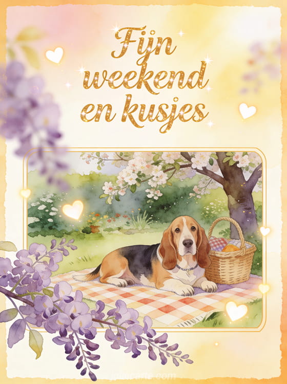 Deel een zonnige weekendkaart met gouden letters, seringtakken over de rand, een basset hound naast een picknickmand onder een bloeiende tuinboom. Verstuur ook dikke kussen fijn weekend, fijn weekend en dikke kussen of fijn weekend dikke kus.