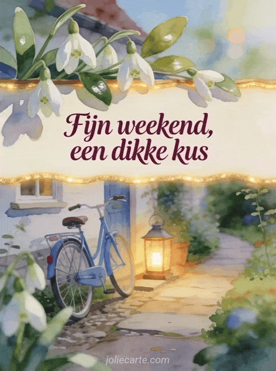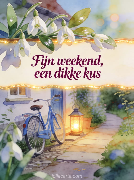 Stuur een tedere fijn weekend groet met een dikke kus, sneeuwklokjes over de rand en een tuinpad bij een huisje met een blauwe fiets en een brandende lantaarn. Ontdek ook heb een fijn weekend kusjes, tederheid fijn weekend kusjes of fijn weekend kusjes.