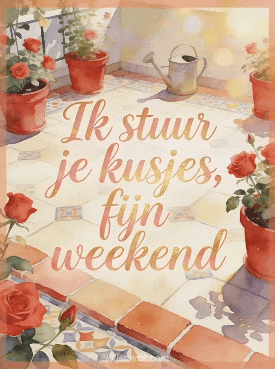 Stuur een serene weekendkaart met aquarelletters, potten met rode rozen, een zonnig terras met tegels en een kleine gieter. Ontdek ook een gif kusjes fijn weekend, een fijn weekend kusjes gif of een een fijn weekend.