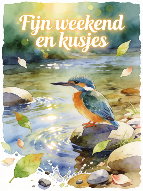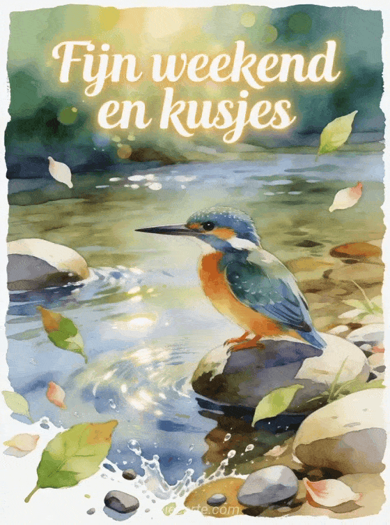 Deel een lichte weekendwens met aquareltekst, een ijsvogel bij een heldere rivier, gladde stenen en frisse bladeren. Ontdek ook een kaart voor kusjes weekend, een kaart voor fijn weekend kusjes afbeelding of een kaart voor fijn weekend geanimeerde kusjes.