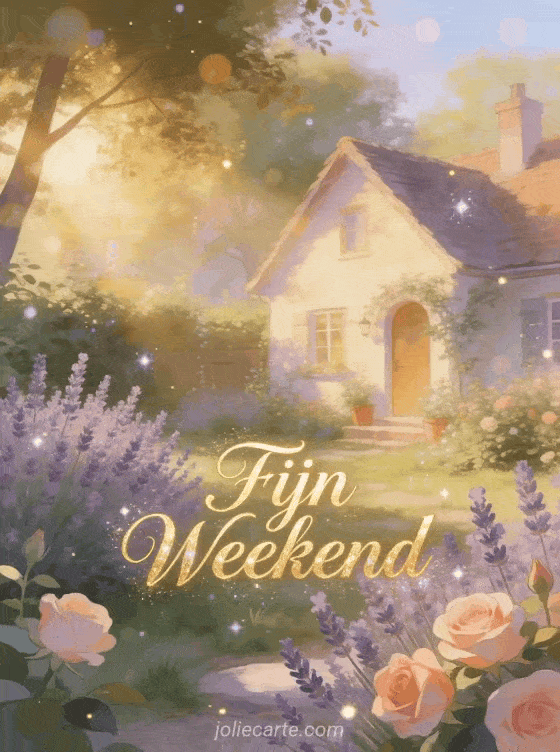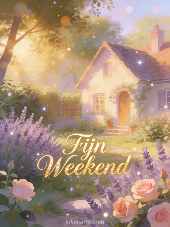 Stuur een elegante fijn weekend wens met een gezellige cottage tuin vol bloeiende lavendel en rozen in warm middaglicht.