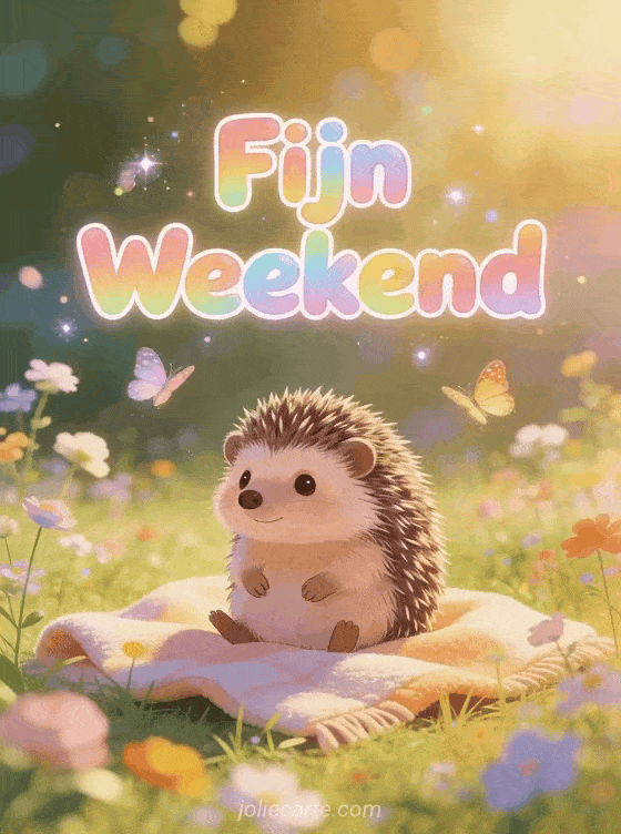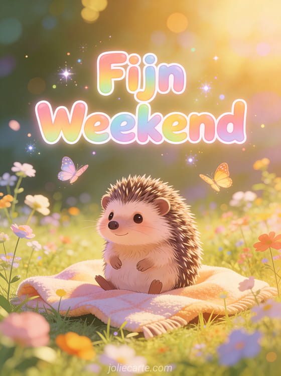 Wens iemand een prachtig weekend met deze schattige egel-kaart op een bloeiende weide. Ontdek ook een fijn weekend gewenst kaart of een fijn weekend zon humor kaart.