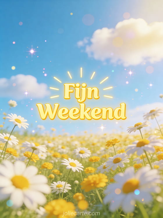 Stuur een vrolijke weekendgroet met een weids margrieten veld onder een stralend blauwe zomerse hemel. Bekijk ook een fijn weekend bloemen of een afbeelding fijn weekend kusjes.