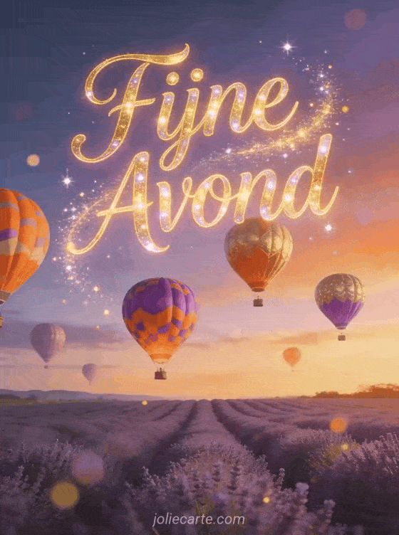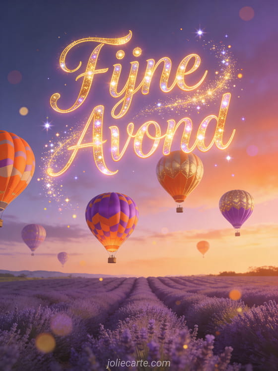 Stuur een magische fijne avond afbeelding met kleurrijke luchtballonnen boven lavendelvelden. Ontdek ook een fijne avond kaart met gedachten of een fijne avond in de zon kaart.