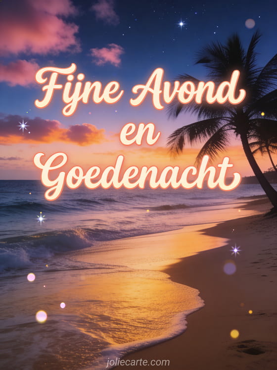Stuur een prachtige fijne avond en goedenacht groet via deze gratis wenskaart. Een tropisch strand in de schemering met palmsilhouetten, zachte golven op goudkleurig zand en een hemel die overgaat van roze oranje zonsondergang naar een diepe sterrenhemel boven de oceaan. Bekijk ook een fijne avond goedenacht of een bericht goedenacht.