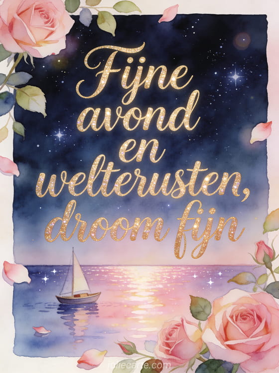 Deel een fijne avond en welterusten bericht met vloeiende gouden letters, een kleine zeilboot op een rustig sterrenmeer, roze weerspiegelingen en roze rozen. Je kunt ook een welterusten bericht voor je geliefde, een teder bericht om welterusten te zeggen of een welterusten bericht voor je lief sturen.