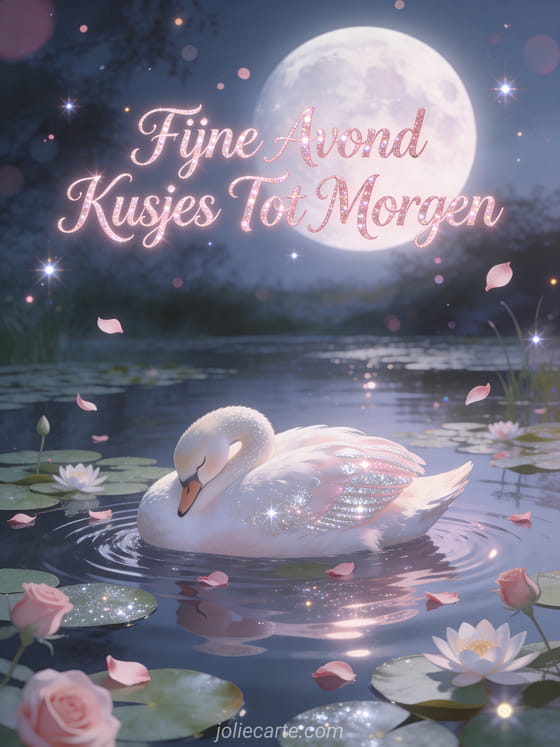 Stuur een elegante fijne avond kusjes tot morgen kaart met een slapende zwaan op een maanverlichte vijver met waterlelies, drijvende rozenblaadjes en zachte rimpels in een romantische serene avondsfeer. Ontdek ook een fijne avond tot morgen in afbeeldingen kaart of een fijne avond tot morgen humor kaart of een goede nacht tot morgen kusjes gif kaart.
