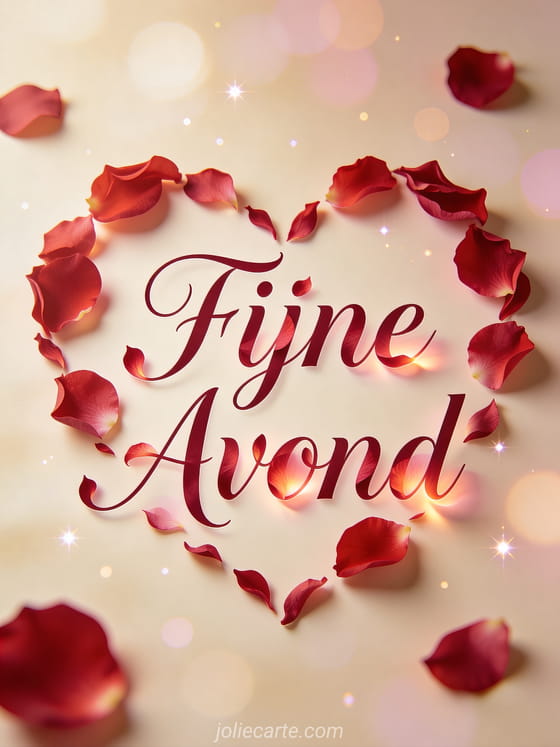 Stuur een tedere fijne avond kussen groet via deze gratis wenskaart. Verspreid rode rozenblaadjes die een hartvorm vormen met zachte belichting, een teder genegenheidssfeer met diep roze en crème tinten. Bekijk ook een fijne avond vriendinnen humor of een tekst om fijne avond te wensen.